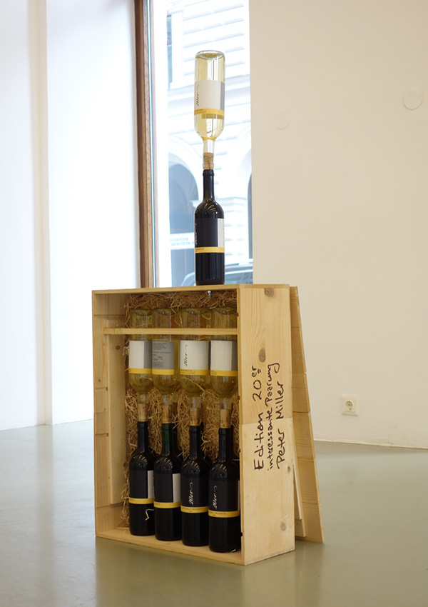 Interessante Paarung (Interesting Pairing), 10 coupled red and white wine bottles in wooden box, 123cm x 50cm x 20cm, 2017 Here the white wines are Grüner Veltliner and the red wines are Roter Zweigelt, courtesy the Vintner Franz Zwanzinger in Enzersfeld, Austria.